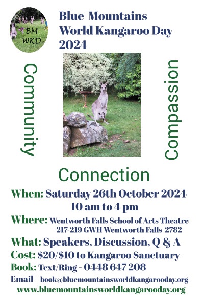 The main Blue Mountains World Kangaroo Day Event was in the format of a seminar with speakers, Q & A and panel discussion - see BMWKD24 Saturday Program.
